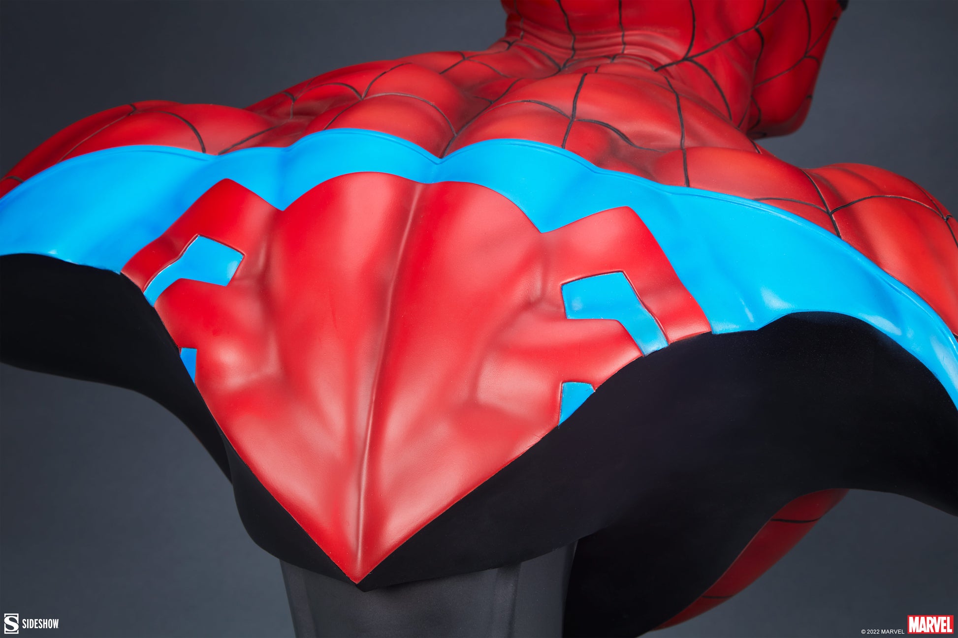 Perched on a sleek silver base, all the focus remains on the wall-crawler, whose detailed costume sculpt features black web impressions, a raised black spider-symbol on his chest, and large white eyes on his mask to give him a classic Spidey expression. Hints of blue can be seen on his back, and the entire bust is painted dynamically to emphasize Peter Parker’s agile, athletic physique.